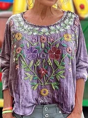 Women's Vintage Ethnic Floral Art Print Casual Cotton Linen Shirt